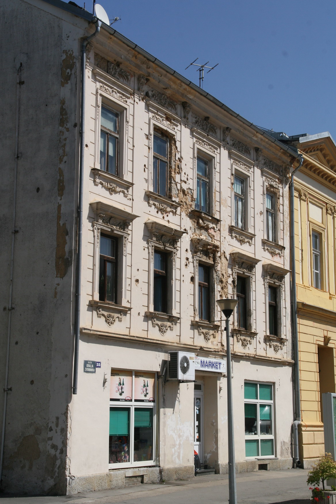 Artillery fire on a building facade in Otocec, Croatia.