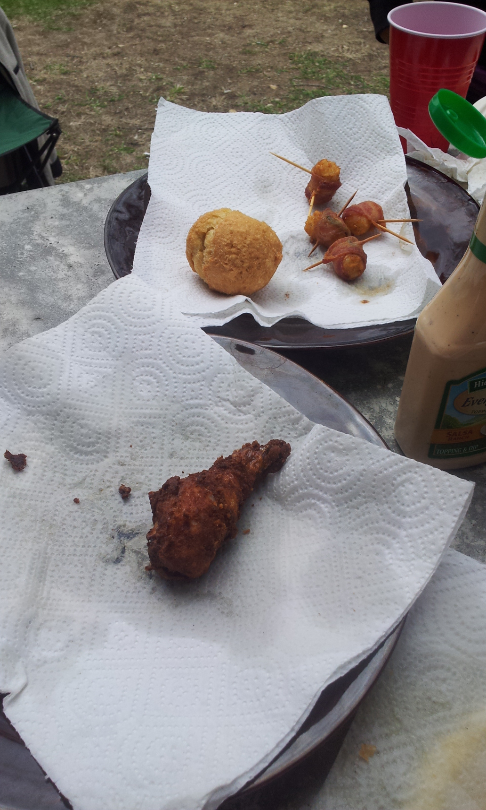 I wasn’t terribly disappointed that I couldn’t try everything, the gluten-filled items were fried in a separate dutch oven and put on separate plates. In a way, it saved me from overeating and I honestly filled up on pickles. I had one bite/piece of all the gluten free items, and then had a lot of rum punch, and switched back to water for the end of the evening. The chickens enjoyed the corn cobs and any remaining tasty bits on them.