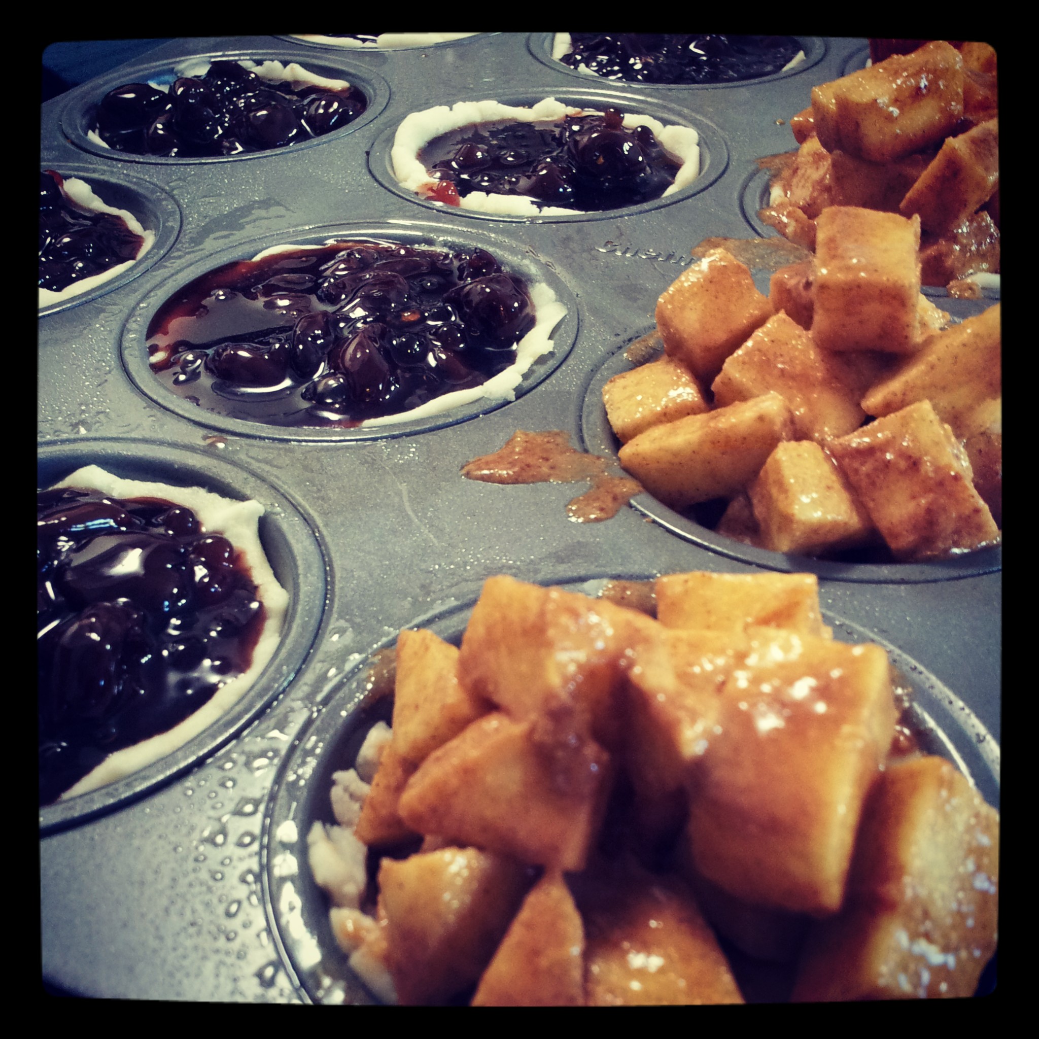 I also made mini-pies with Pillsbury’s gluten free pie and pastry dough. This was my second go at mini-pies because the first time was such a rousing success. Basically, I sprayed down a muffin tin with nonstick spray, squished balls of the dough into each cup in the pan and filled them up with cherry pie filling (homemade with Door County cherries) and apple pie filling made with a couple apples from the neighbor’s tree.