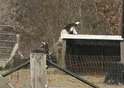 Meanwhile, enjoy this picture of my goat Marilou showing her smarts this morning. She’s the “baby” and instead of taking a jostling from the bigger goats and sheep trying to eat the hay – she approaches it from the top. Smart girl!